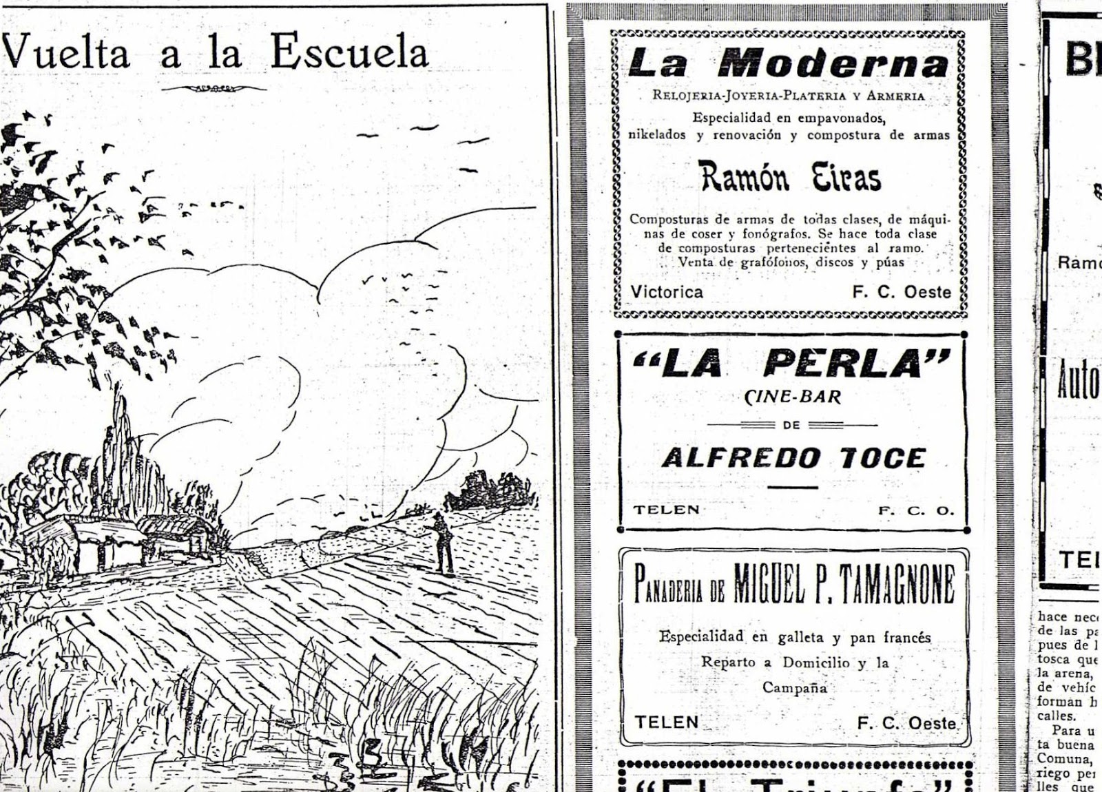 En la página tres aparece un gran aviso con ilustraciones de un comercio de Telén promocionando la venta de automóvil y camiones que habían comenzado a circular por los todavía caminos de huella en la zona oeste del Territorio Nacional.