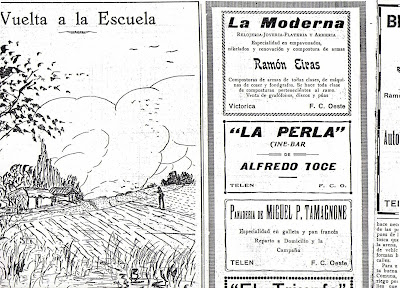 La página dos comienza con un gran dibujo que ilustra el tema de la Vuelta a la Escuela. Pero aquí comienzan a aparecer los avisos comerciales, con los cuales se sufragaban los gastos de publicación del periódico que era de los denominados “tipo sábana” y que solían tener 4, 6 u 8 páginas según fuese la ocasión.